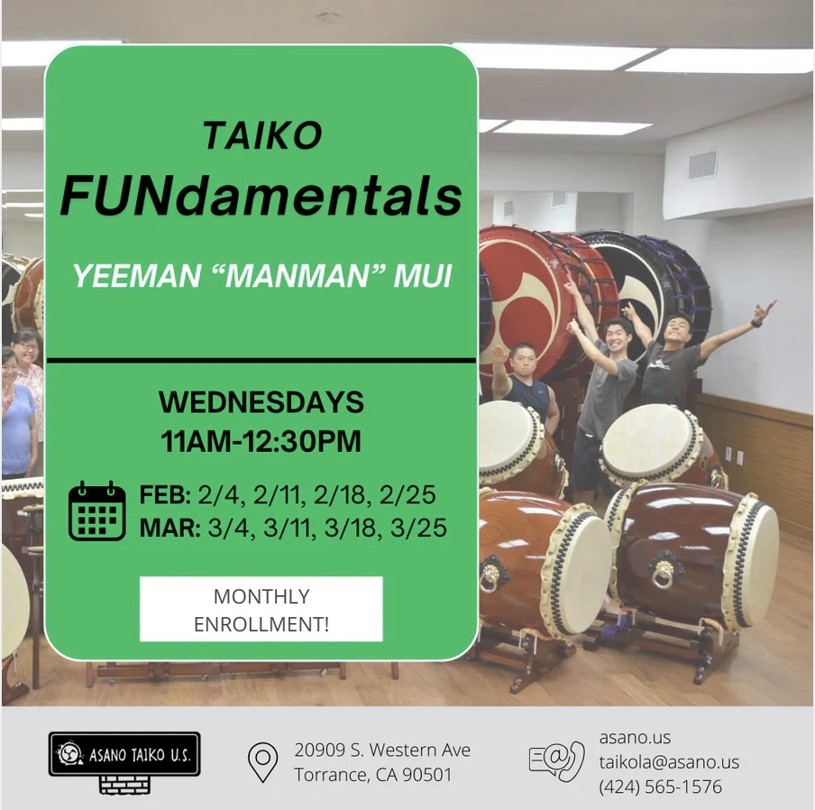 ASANO TAIKO U.S., Inc. 20909 S Western Ave, Torrance, CA, United StatesPreparation for learning "Mochizuki 望月" a festive and energetic piece on beta and odaiko style composed by Aki Takahashi (Ten Ten Canada) Unleash your inner child through playful chanting and drumming exercises Utilize vocal drills to activate core strength to create powerful taiko strikes